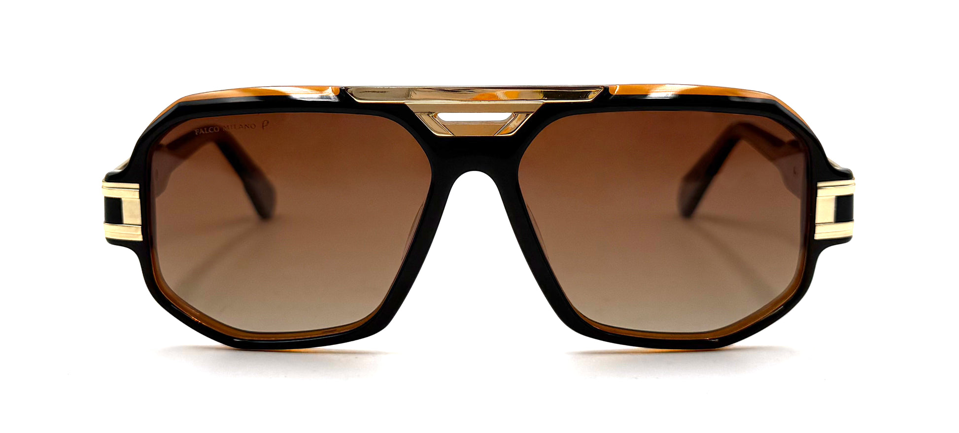This style features an Orange and Gold frame made from Acetate, fitted with Brown Polarized lenses.