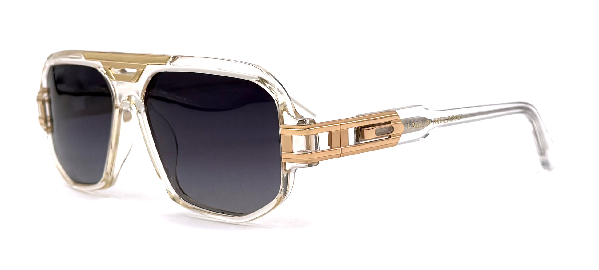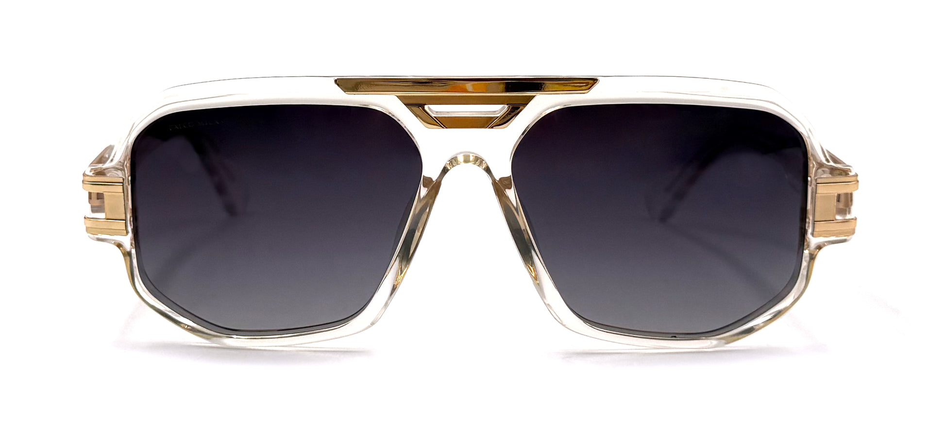 This style features a Transparent and Gold frame made from Acetate, fitted with Grey Polarized lenses.