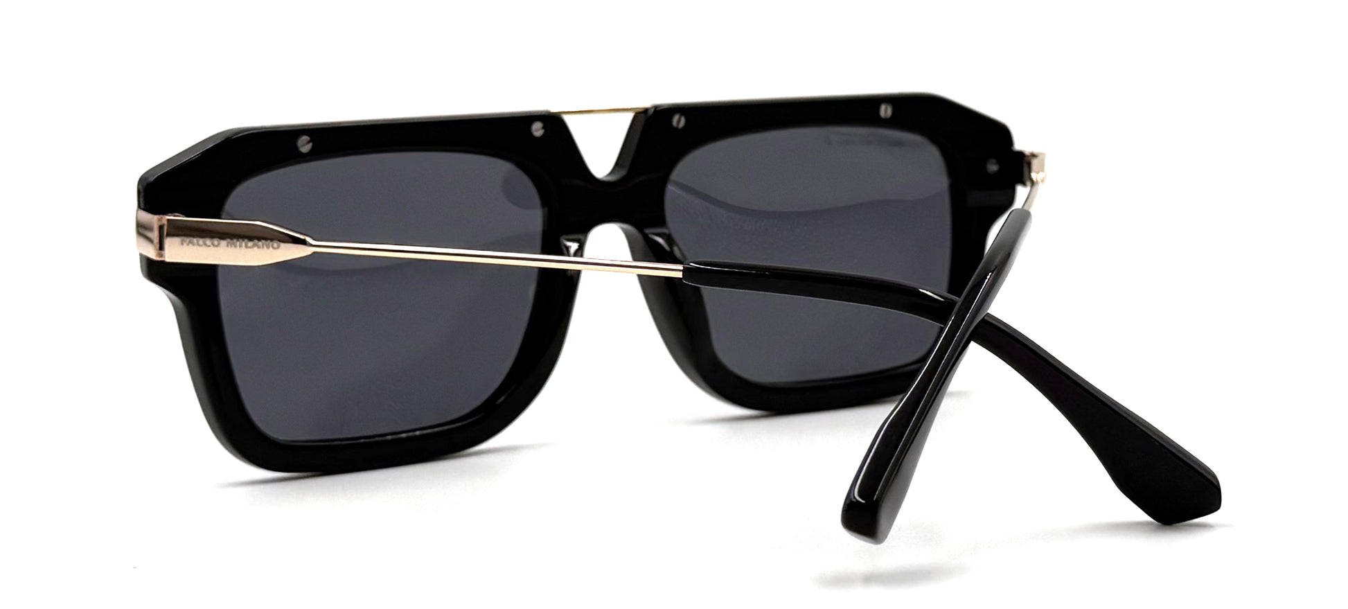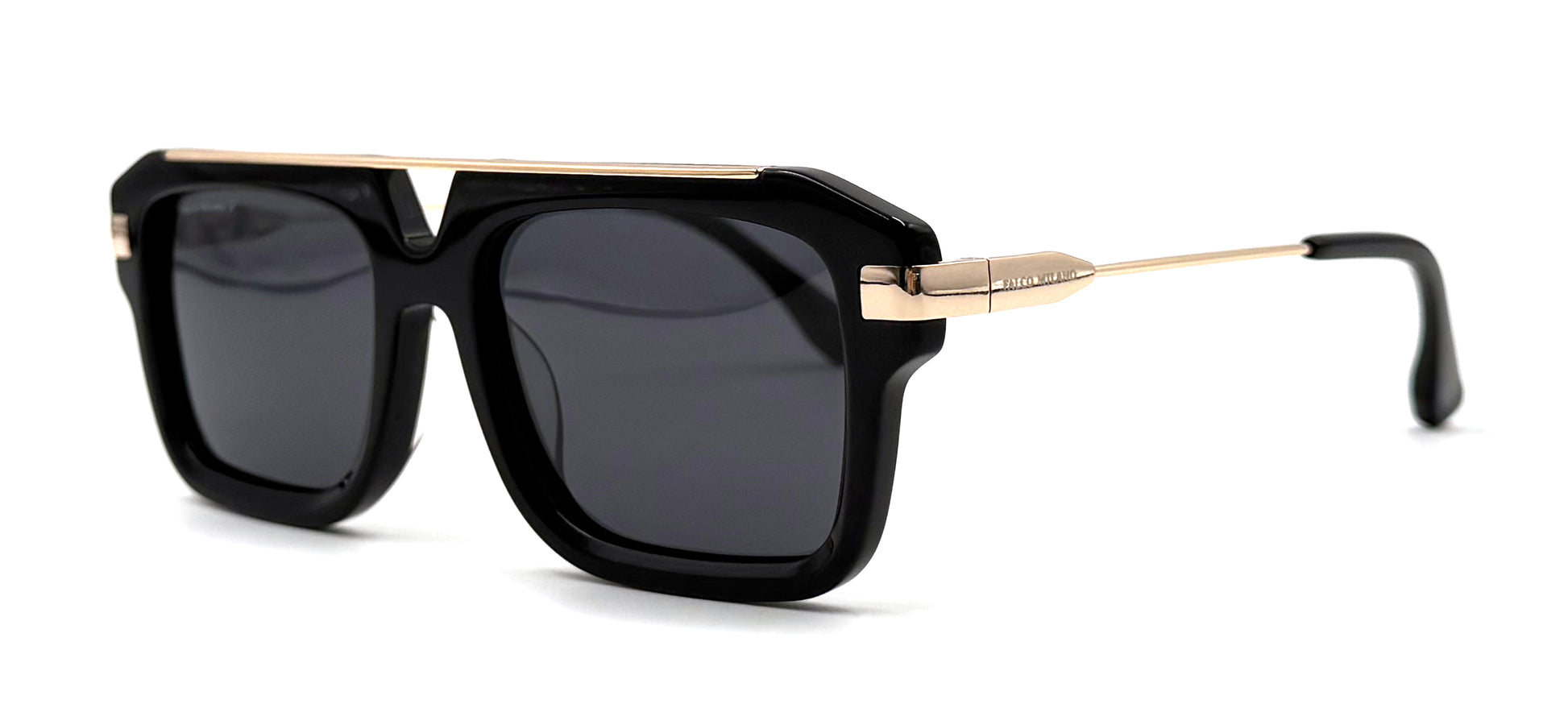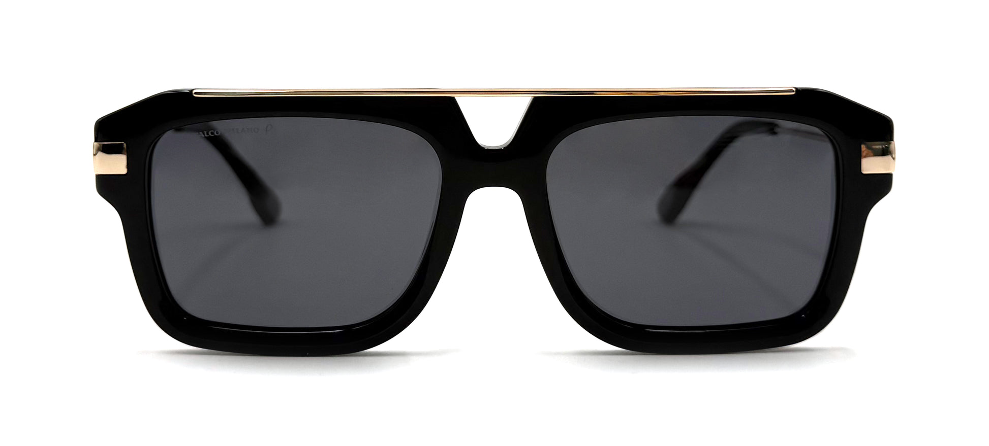 This style features a Black and Gold frame made from Acetate and Metal, fitted with Grey Polarized lenses.